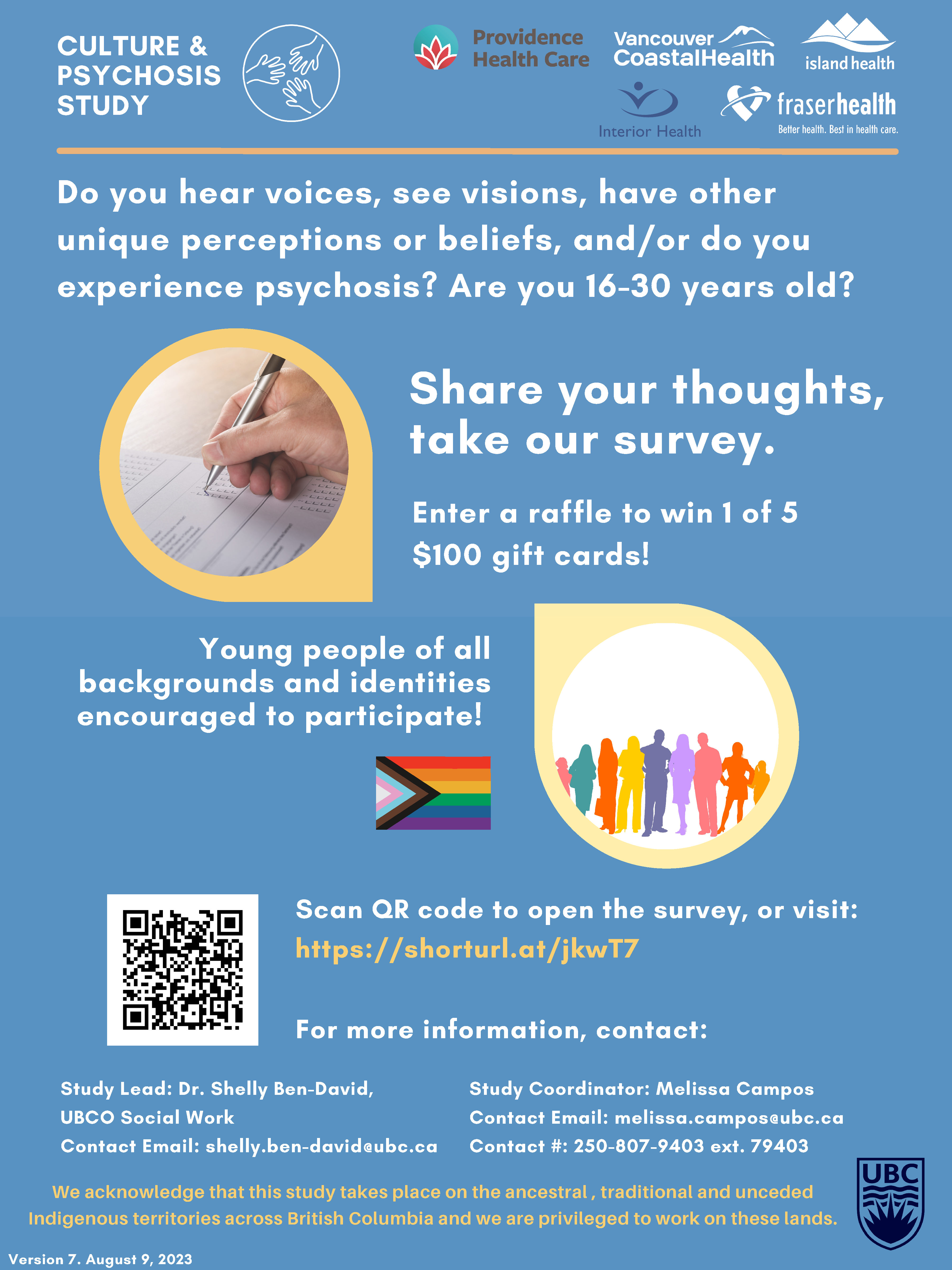 Researchers at the Early Psychosis Peer Recovery Network (EPPRN) and the University of British Columbia are conducting an online survey to better understand how experiences like psychosis and hearing voices fit into young people’s lives, including their culture, communities and relationships. This survey is open to young people of all backgrounds and identities who: