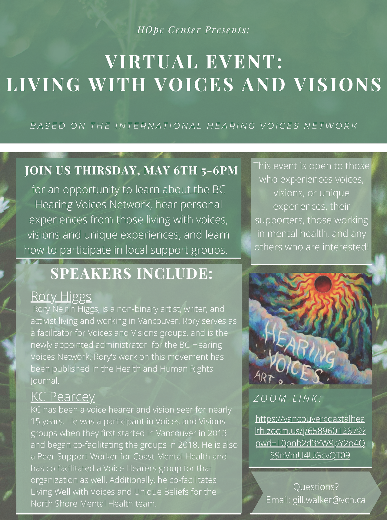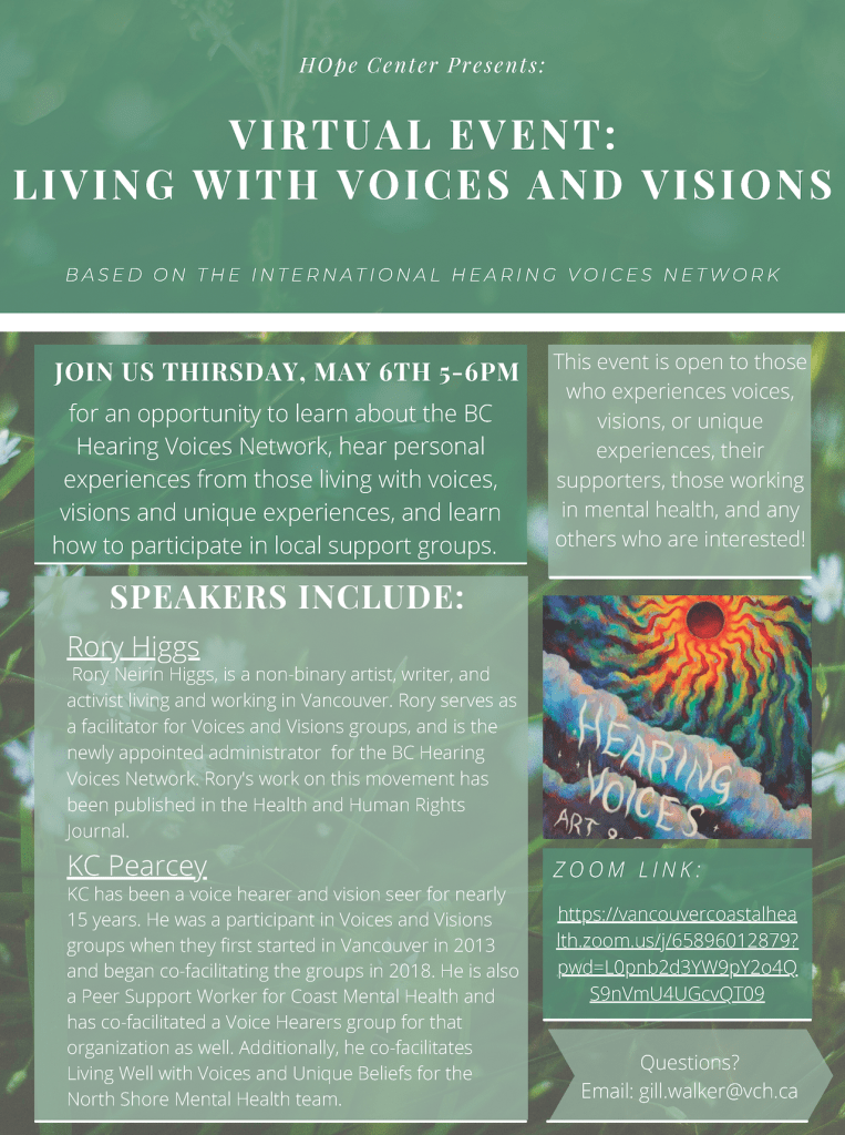 Voices and visions occur in the context of our lives, and can have different meanings and causes for different people. For some, these experiences are directly or indirectly related to experiences of trauma, injustice, discrimination, and disenfranchisement over our lifetimes. We hope to see lasting efforts to change the aspects of society that overwhelmingly create distress rather than focusing exclusively on changing individual people, which pathologizes understandable reactions to suffering and overlooks the communities we share – and which we share a responsibility to ensure are safe, just, and equal for all.