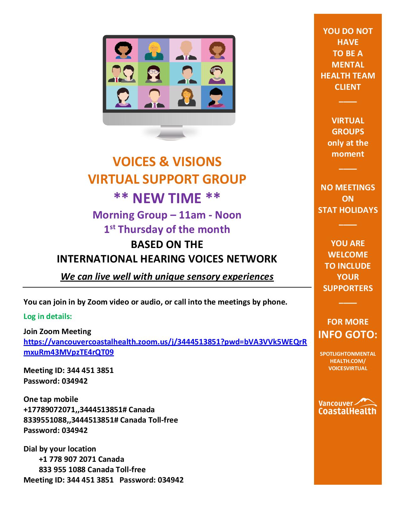 The Thursday Vancouver support group will now be held from 11 am to 12 pm (noon) instead of in the evening. This group is held over Zoom on the first Thursday of every month. You can visit the Vancouver groups page for more information, or see the flyer below.