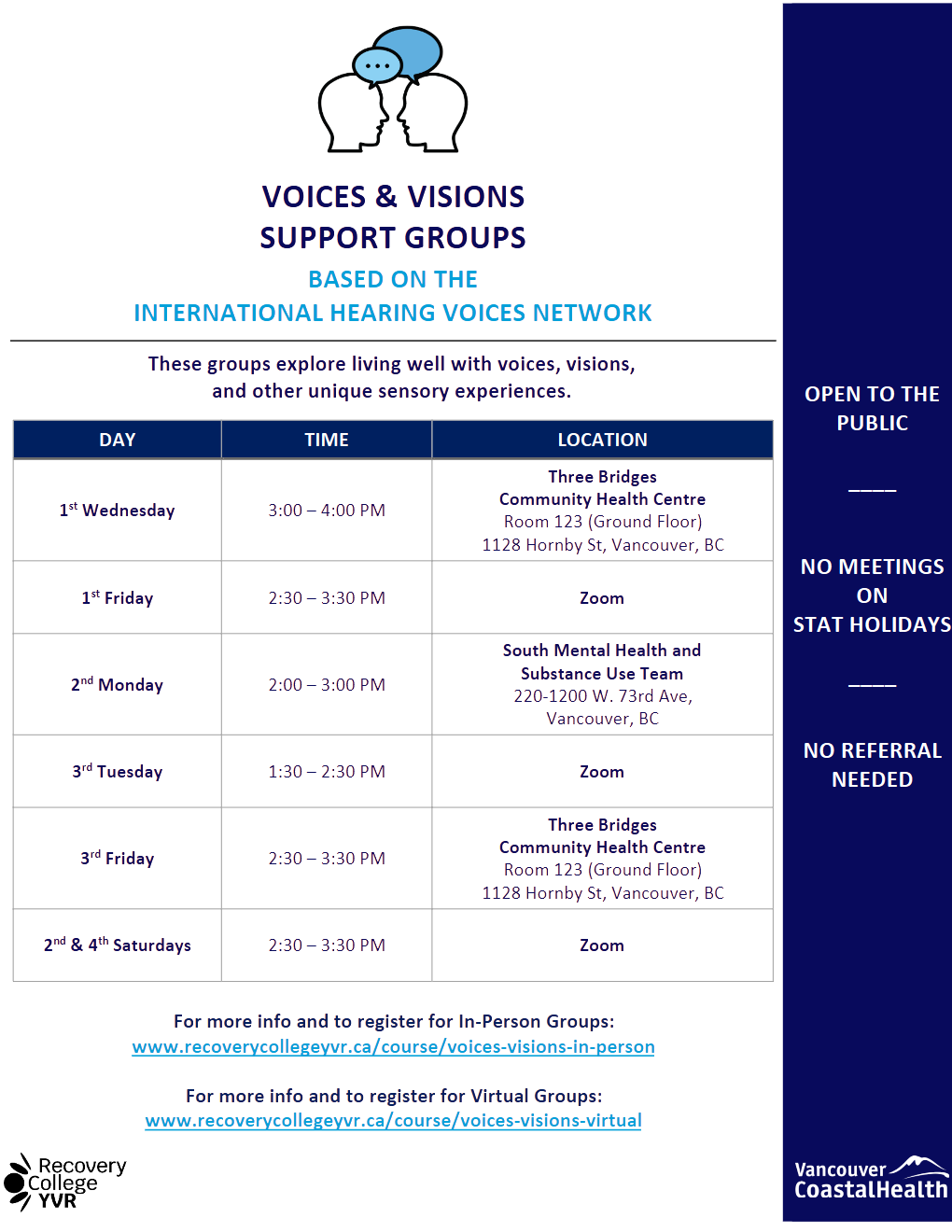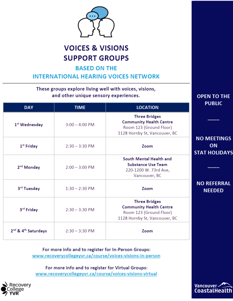 For questions about Voices & Visions support groups in Vancouver, please contact the VCH Peer Led Workshops program at: 604-708-5274 or info@spotlightonmentalhealth.com.